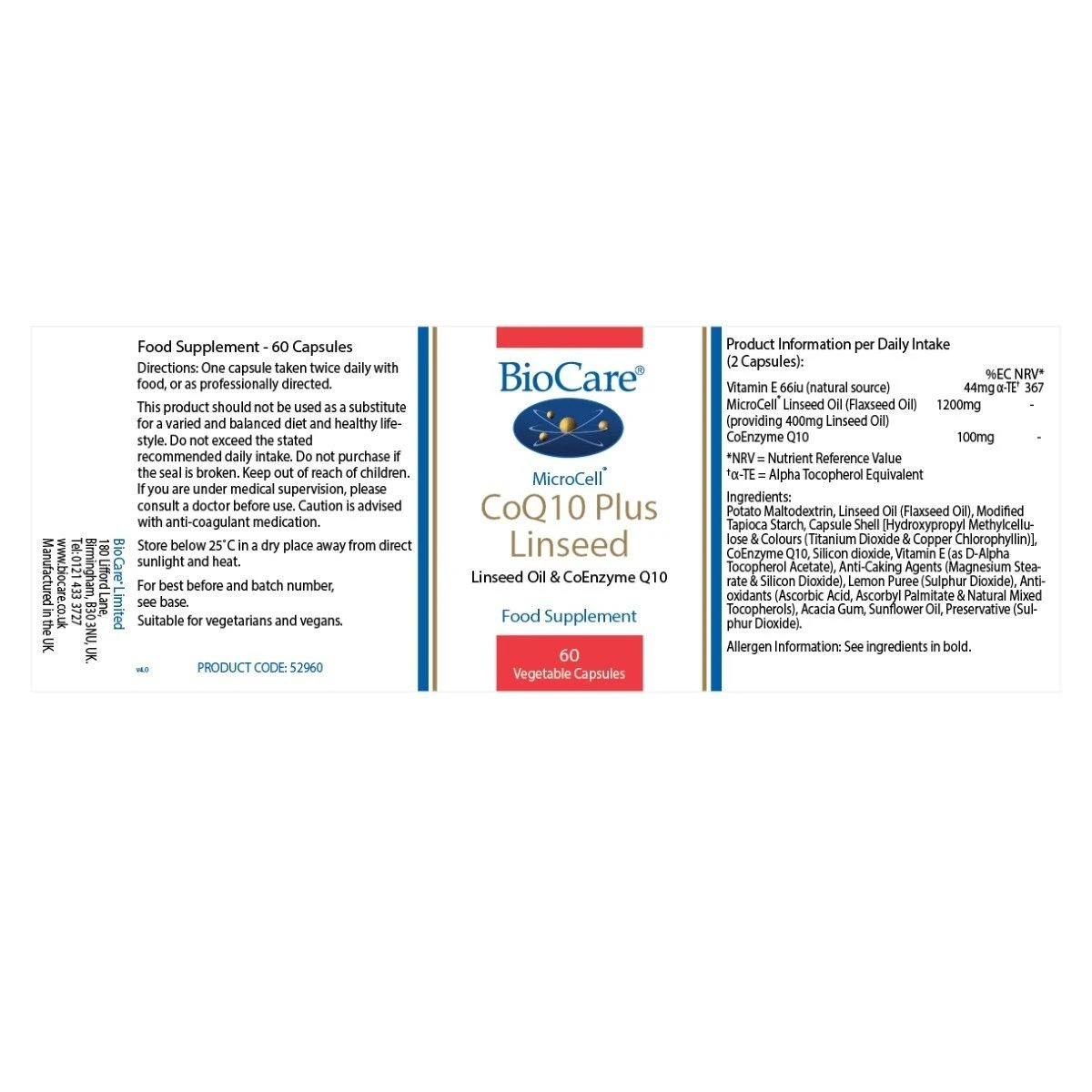 BioCare MicroCell CoQ-10 Plus Linseed Key Information: