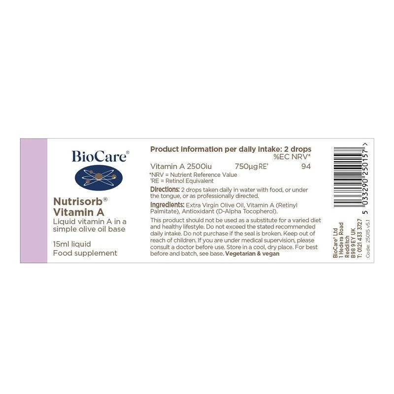 BioCare Nutrisorb Vitamin A Liquid is a in simple olive oil base to help support immunity, healthy skin and vision.