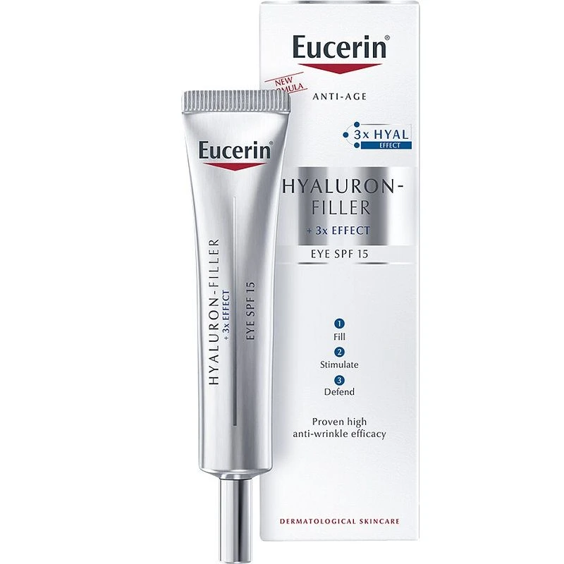 As we age, our skin’s own production of Hyaluronic Acid decreases causing the skin to form wrinkles and look older. Eucerin Hyaluron-Filler Eye SPF 15 with 3x Effect formula counteracts this process: