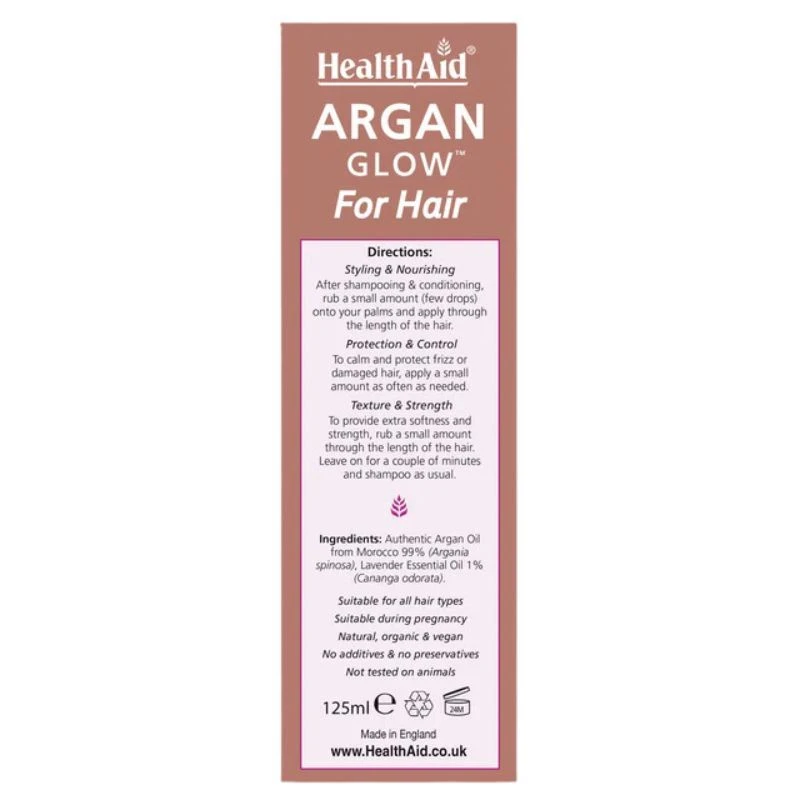HealthAid Argan Glow Hair Oil, contains Organic Certified Argan Oil with Pure Lavender Oil to provide a unique nourishing and moisturising result. It helps to penetrate the hair shaft and repair damaged hair follicles. It is immediately absorbed by the hair and it restores lost moisture. One of the fantastic things about HealthAid Argan Glow Hair Oil is that it is non-greasy, and won’t weigh down hair or make it limp. It is ideal for taming rough, dry, frizzy and unmanageable hair. Since it is light and almost weightless, there is less probability of build up. It helps to restores the lost luster from too much hair straightening and other chemical treatments; It also acts as a shield from harmful UV rays and protects the hair from environmental pollution. Argan oil is often referred to as a miracle product because of its extreme moisturising benefits for both hair and skin.