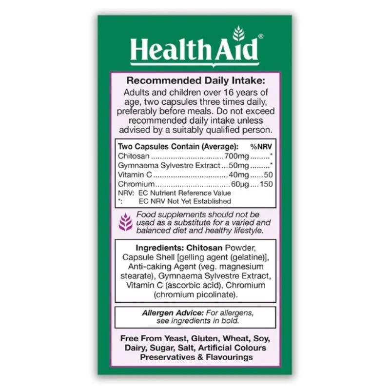 Chitosan Complex Capsules contain Chitosan, which is a non-digestible dietary fibre derived from shell fish. It has an amazing ability to bind to fats; encapsulating them before they can be absorbed and converting them into a non-digestible form. HealthAid Chitosan complex offers a unique combination of Vitamin C, Gymnaema Sylvestre Extract and Chromium which work synergistically to assist the body in weight loss by helping to increase fat oxidation and suppress food cravings. Taken as part of a calorie controlled diet, and exercise regime, Chitosan Complex could reduce unwanted fat and achieve optimal weight loss goals.