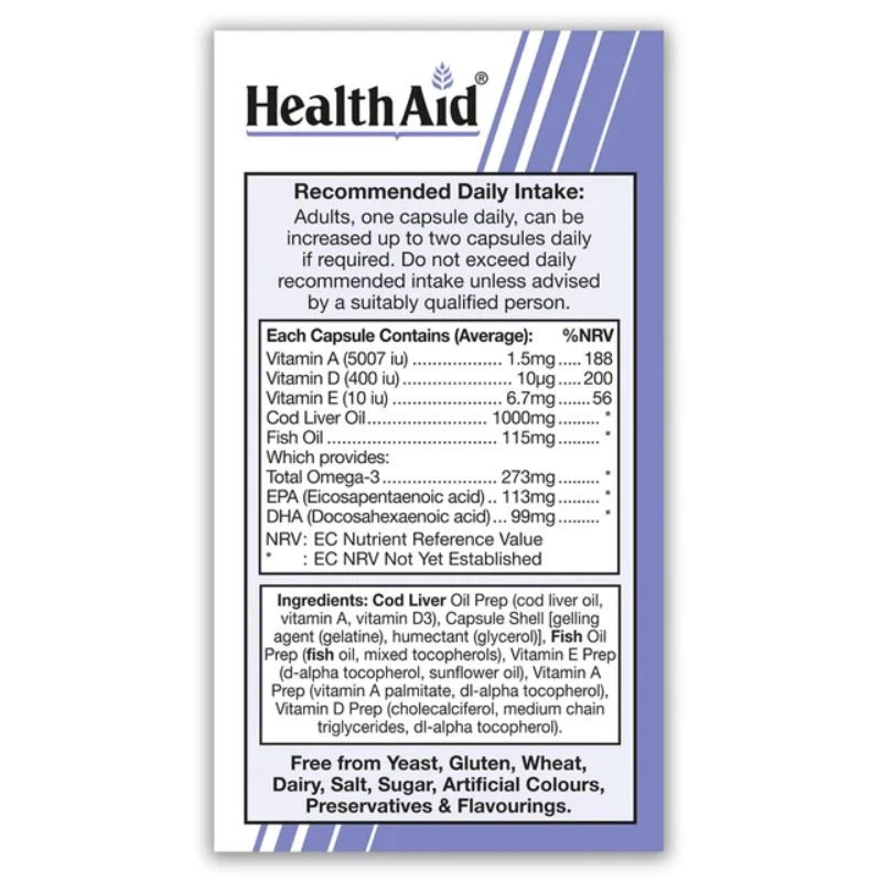 Cod Liver Oil is a rich source of Omega 3 fatty acids, Vitamin A and D. It is beneficial for maintaining a healthy cardiovascular and nervous system; and supporting strong healthy bones and joints. HealthAid Cod Liver Oil is virtually free of all impurities. It is enriched with Vitamin E; cold pressed and hermetically sealed in a soft capsule to maintain freshness and purity.