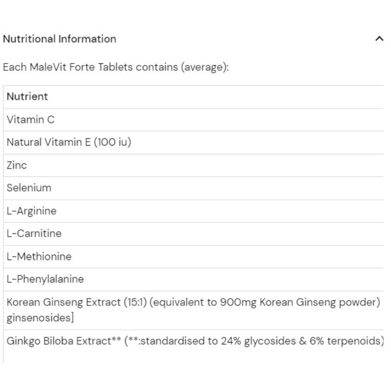 Malevit Forte tablets contain a synergistic blend of essential vitamins, minerals and amino acids with Korean ginseng and Ginkgo biloba, to provide a natural aphrodisiac formulation, offering comprehensive nutritional support for all aspects of male sexual function.