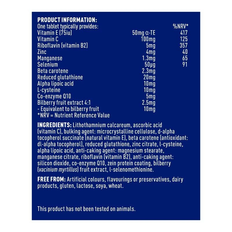 One tablet typically provides: 50mg Vitamin E, 100mg Vitamin C, 5mg Vitamin B2, 4mg Zinc, 50µg Selenium, 1.3mg Manganese, 2.3mg Beta carotene, 20mg reduced Glutathione, 10mg Alpha Lipoic acid, 5mg L-Cysteine, 5mg N-Acetyl Cysteine, 5mg Co-enzyme Q10, 10mg Bilberry fruit, 10mg Chicory root.