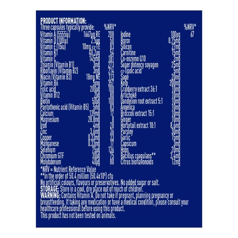 Vitamins: Vitamin A (5000iu) (retinol) 1500µg, True Food Beta Carotene 1mg, True Food Thiamin (Vitamin B1) 3mg, True Food Riboflavin (Vitamin B2) 3mg, True Food Niacin (Vitamin B3) 18mg, True Food Pantothenic Acid (Vitamin B5) 5mg, True Food Vitamin B6 5mg, True Food Vitamin B12 2µg, True Food Folic Acid 200µg, True Food Biotin 0.05mg, Vitamin C (True Food Vitamin C, 143mg Magnesium Ascorbate) True Food Bioflavonoids 12mg, True Food Vitamin D (100iu) 2.5µg, True Food Vitamin E (15iu) 10mg, True Food Vitamin K 40.2µg