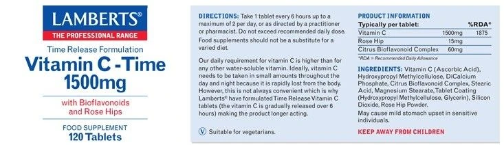 Lamberts Time Release Vitamin C 1500mg tablets also contain a relevant level of bioflavonoids, the natural compounds that are often associated to vitamin C in fruits and vegetables.