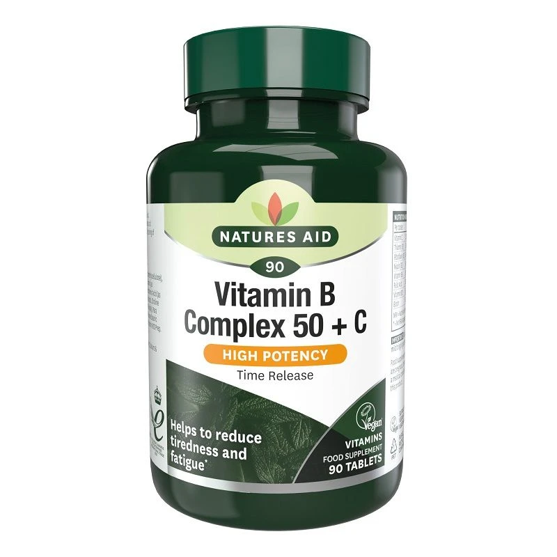 Nature’s Aid Vitamin B Complex 50 + C Tablets are carefully balanced Vitamin B+C complex provides a combination of all eight B Vitamins: Vitamin B1, Vitamin B2, Niacin (vitamin B3), Pantothenic Acid (B5), Vitamin B6, Biotin (B7), Folic Acid (B9) and Vitamin B12.  This group of B vitamins work together to support the body in a number of different ways;