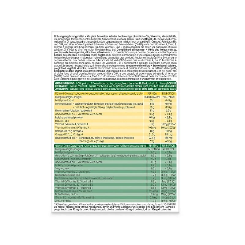 RAUSCH SWISS HERBAL VITALITY CAPSULES contain 23 herbal active ingredients, 3 high quality vegetable oils, 8 active herbal ingredients and 12 vitamins and minerals for strong, rich hair, smooth, firm skin, healthy, strong nails, vitality and well-being.