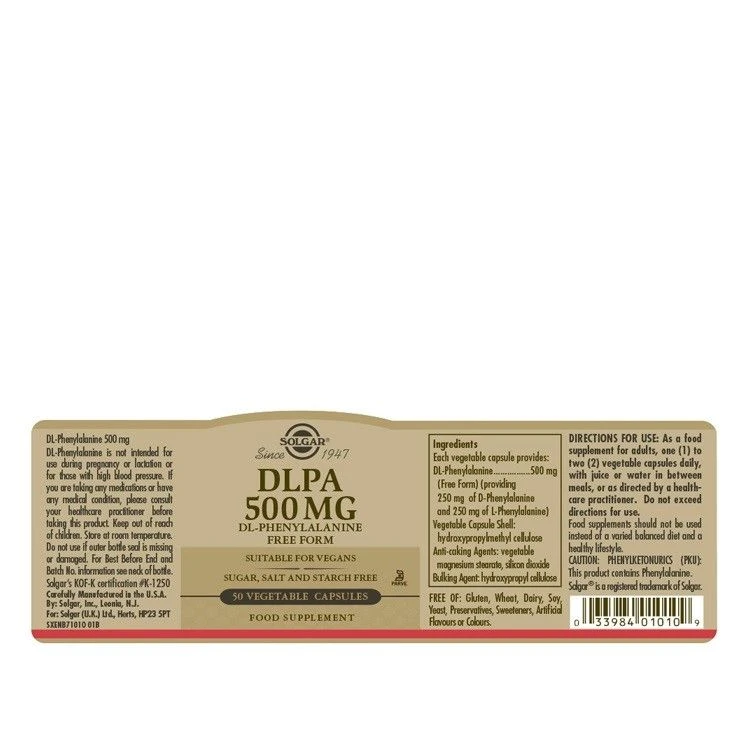 Solgar DLPA 500 mg (DL-Phenylalanine) Vegetable Capsules contain DLPA, a mixture of the natural form of Phenylalanine (L form) with its mirror image (D form).