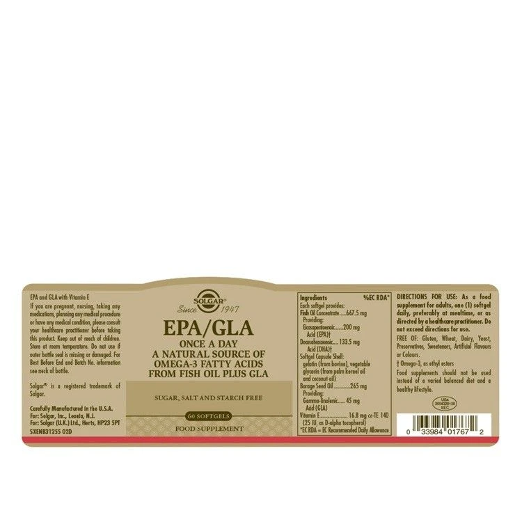 Solgar EPA/GLA provides the body with this trio of essential fatty acids, taken as 1 softgel a day.