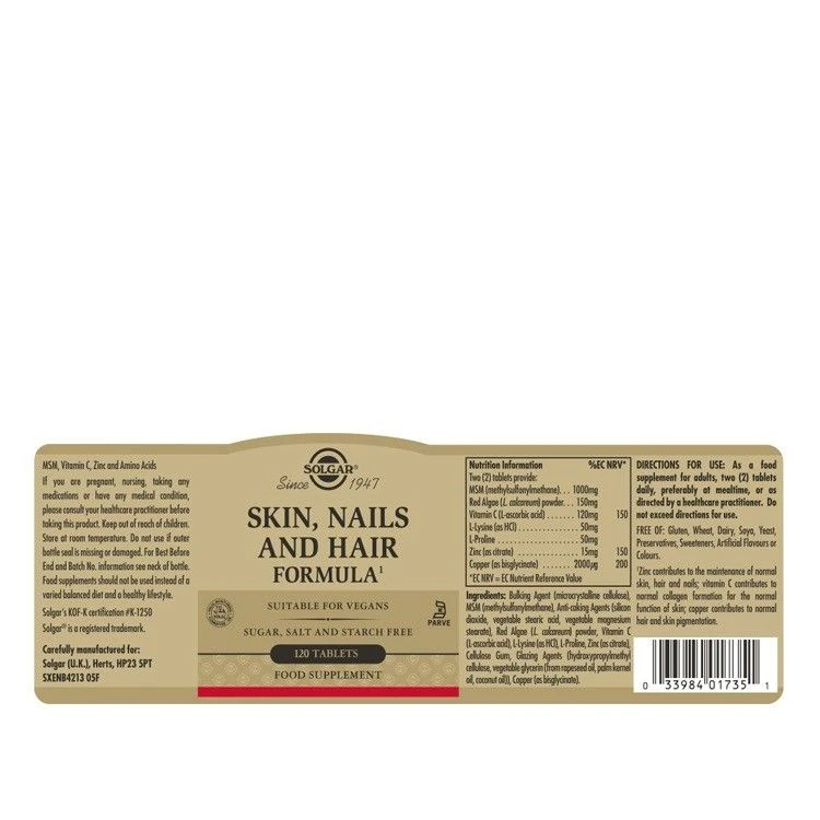 Solgar Skin, Nails and Hair Formula Tablets help to build collagen and keratin, the major building blocks of skin, nails and hair – all of which can decrease as we age and so need a boost of support. It does this with MSM and sulfur compounds, among other vitamins and minerals.Â