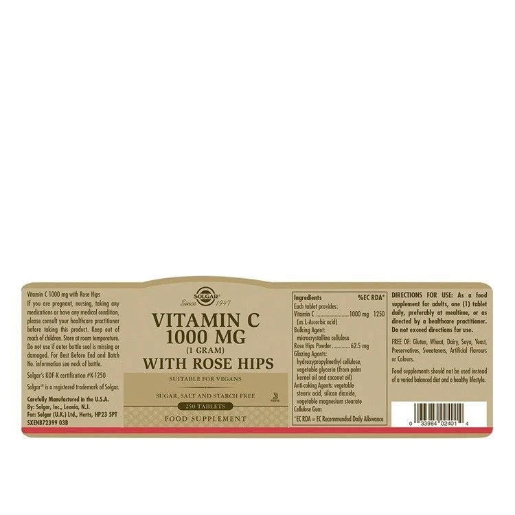 Solgar Vitamin C 1000 mg with Rose Hips is a premium supplement suitable for vegans and just 1 tablet a day provides 1000 mg of Vitamin C and one of its synergistic counterparts, rose hips.