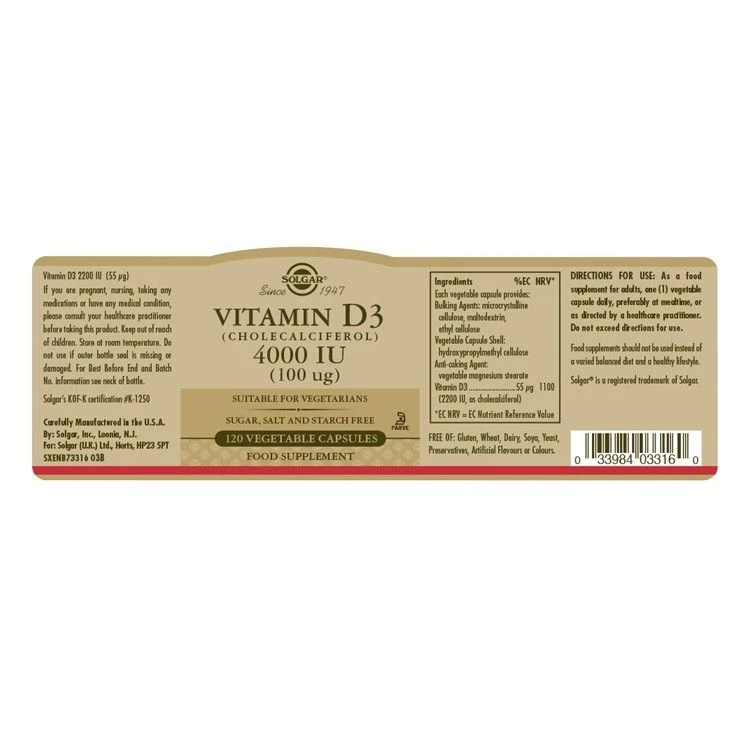 Solgar Vitamin D3 (Cholecalciferol) 4000 IU (100 µg) Vegetable Capsules is a premium formula delivering vitamin D in the form that is easiest to use by the body – D3. Supporting optimal wellbeing, the benefits of the “sunshine vitamin” are numerous and well documented, but particularly for immune health.