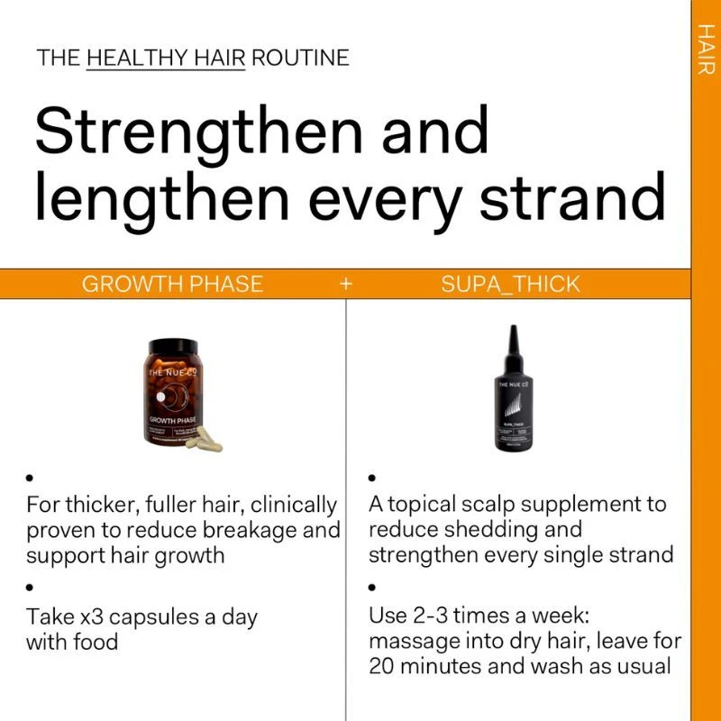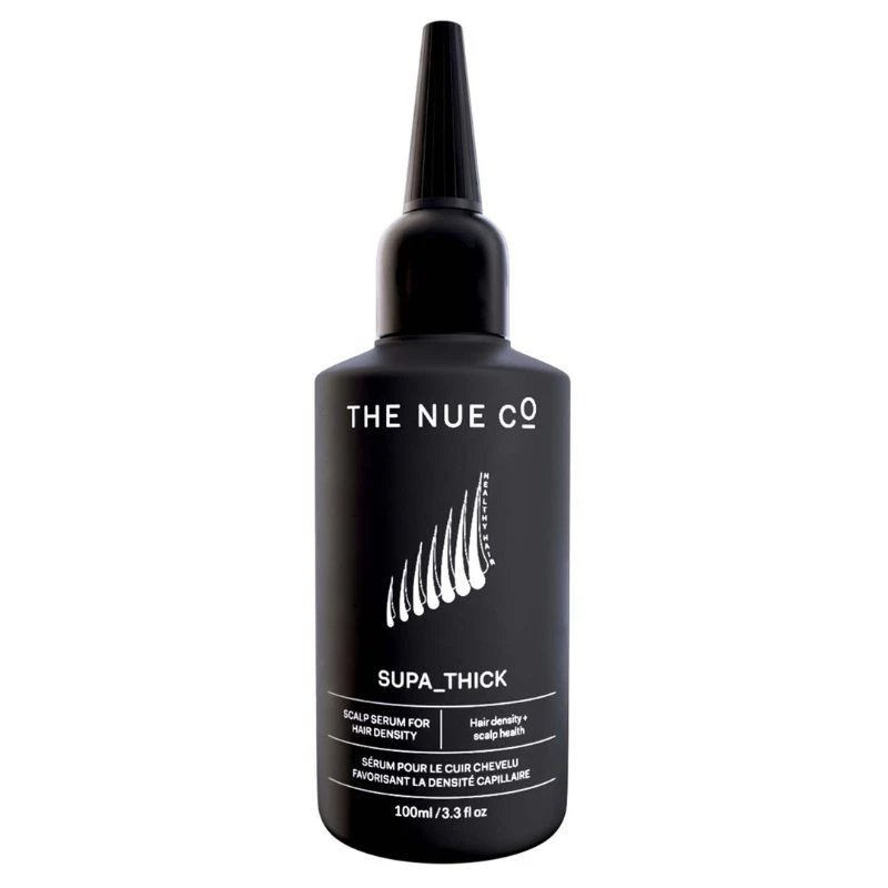- Thickens hair:Â SUPA_THICK is designed to help hair transition to the anagen phase, reducing shedding and encouraging thicker growth with more body. Its patented technology protects and soothes the follicle, boosting its metabolism and strengthening the hair shaft (meaning less breakage). In a clinical study, 88% of users experienced improvements in their hair growth and density after 12 weeks.