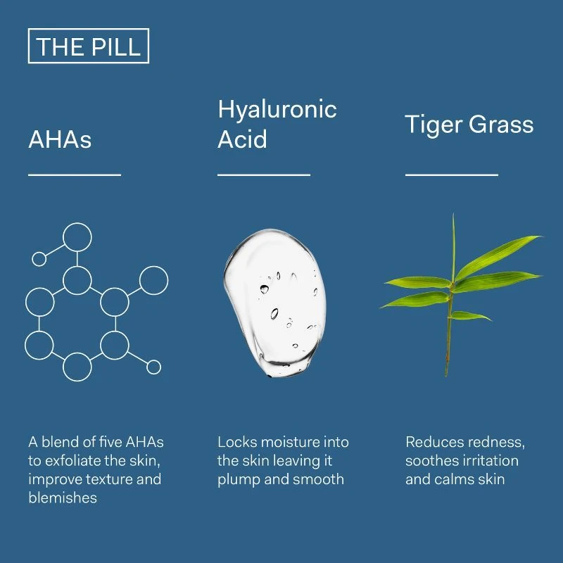 Smooths and Brightens complexion:Â There are 6 AHAs in THE PILL, derived from various natural sources like passion fruit and sugar cane. They gently exfoliate the skin by dissolving the bonds between skin cells, ungluing and lifting away the dead cells to reveal smoother, fresher, brighter skin underneath. The complex of AHAs in THE PILL have been shown to increase cellular renewal by up to 24%.
