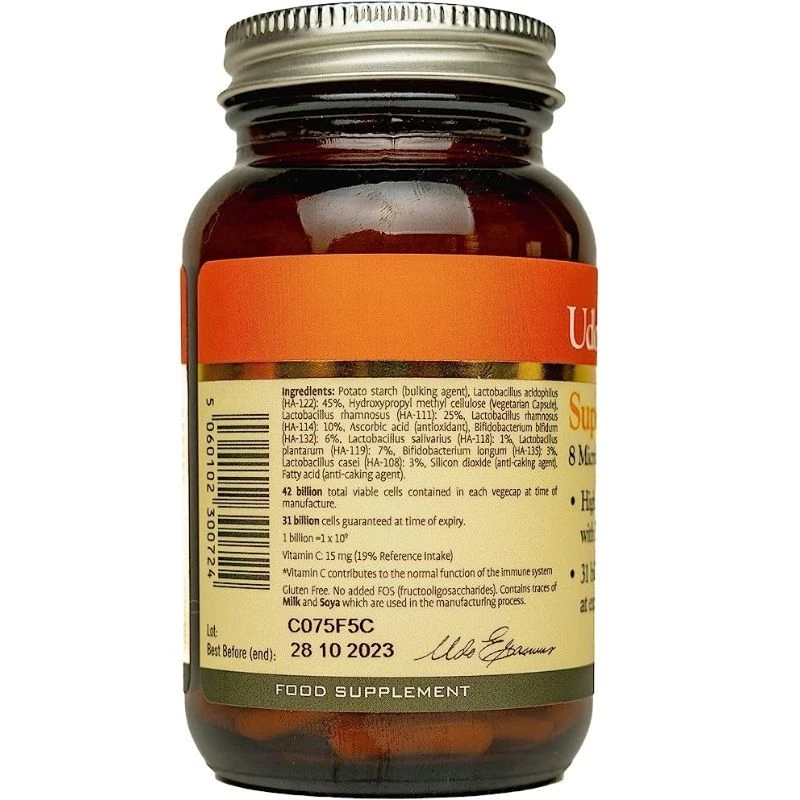 - Udos’ Choice super 8 immune microbiotic with vitamin C contains the same high potency blend of Lactobacillus with Bifidobacterium ”friendly” bacteria well known for its survival and colonisation rates in the gut and vitamin C for immunity.